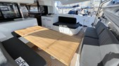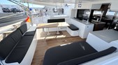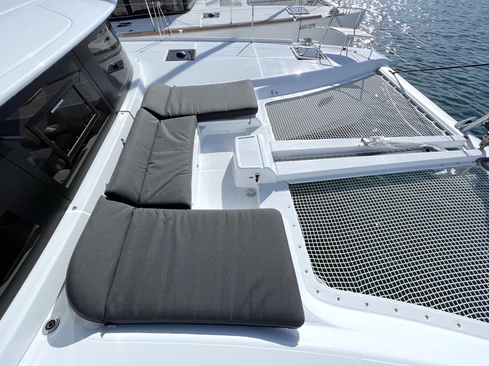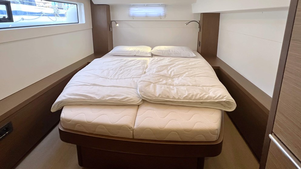 Additional skipper's cabins in the bow, stainless steel dinghy lift system Helmsman's seat with cushion, hull windows in aft cabins with blackout Indirect lighting in cockpit - stern area - flybridge and cabins additional refrigerator 90l, additional freezer 65l Upholstery for rear and front cockpit Bow baskets with seats, Fusion radio with 6 speakers in saloon - cockpit - flybridge Sun deck cushions with backrest on the flybridge additional swimming ladder with shower (cold/warm) Outboard motor bracket on pushpit, rear cockpit and stern steps in teak large folding teak cockpit table with cockpit bench (sliding) Anchor winch with chain counter and remote control at the helm, more powerful engine 57 hp Lazy-Bag and Lazy-Jack 12V refrigerator in cockpit 80l, bimini above helmstand Inverter 12V/220V - 2000VA Double berth in saloon with cushion Microwave 220V with grill function Flexible solar panels with stainless steel support on the rear superstructure roof (4x 115W) Slatted frames under in all cabins