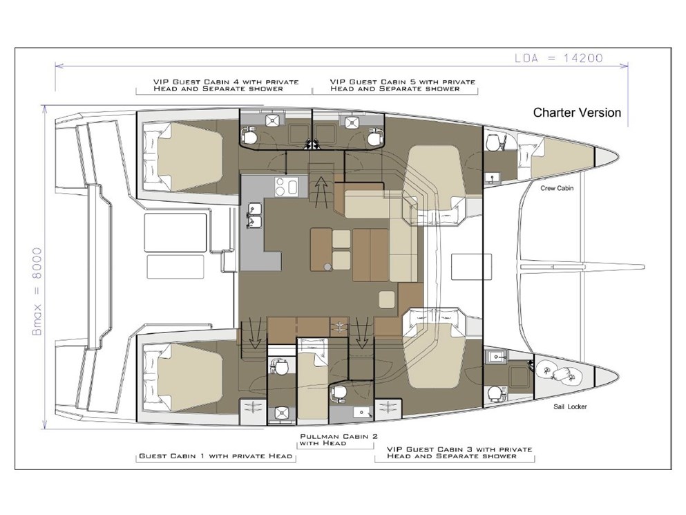| Beam8.00 m | Draught1.30 m | Engine2x60 hp | Fuel capacity900 l | Water capacity700 l | Heads6 |